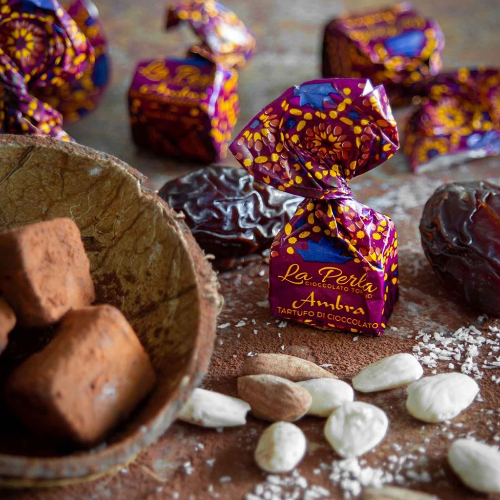 Upptäck vår chokladtryffel med dadlar, mandel och kokos. Den är tillverkad med kärlek och omsorg av La Perla, ett litet familjeföretag känt för sin höga kvalitet och passion för choklad.