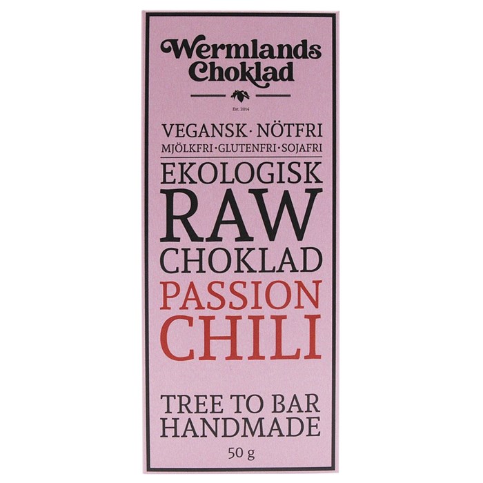 Ingredienser: Kakaomassa*, kakaosmör*, kokossocker*, passionsfrukt*, chili*. *Ekologiskt certifierad ingrediens.