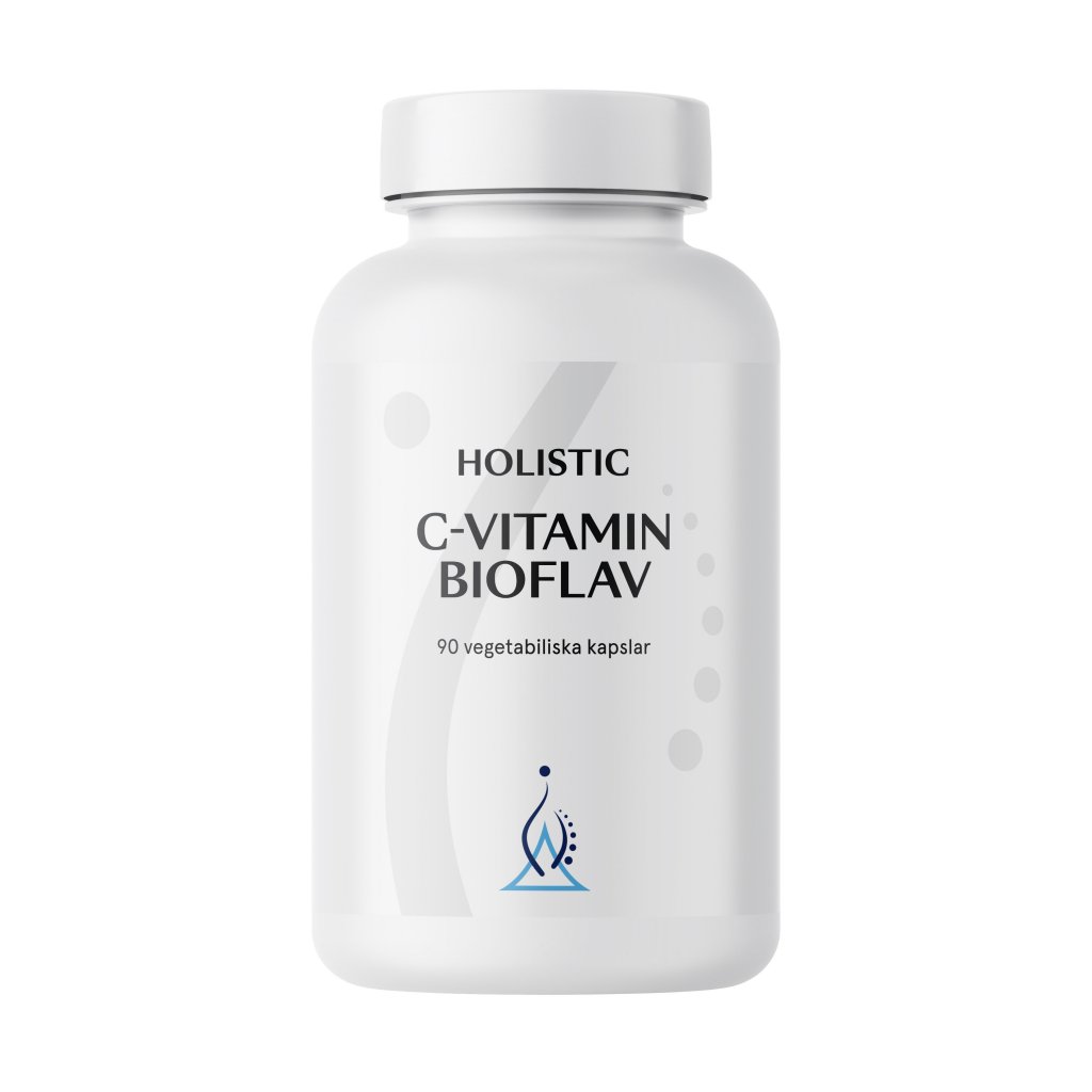Holistic C-vitamin bioflav är ett kosttillskott. Vitamin C bidrar bland annat till att minska trötthe och utmattning, skydda cellerna mot oxidativ stress, immunsystemets normala funktion och normal kollagenbildning som är viktig för benstommens, broskets, tändernas och blodkärlens normala funktion. Dessutom ökar vitamin C järnupptaget. Tänk på vikten av en mångsidig och balanserad kost och en hälsosam livsstil.