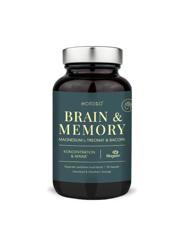 NORDBO Brain & Memory Magnesium är framtagen för minne, koncentration och psykologisk funktion. Med Magtein®, magnesiumbisglycinat och Ebel.One™. Magtein® består av magnesium L-treonat, vilket innebär att magnesium har bundits till aminosyran L-treoninsyra. Magnesium bidrar till att bibehålla normal psykologisk funktion samt till minskad trötthet och utmattning. Ebel.One™ är ett extrakt av bacopa, som bidrar till att bibehålla koncentrationen och minnets normala funktion.