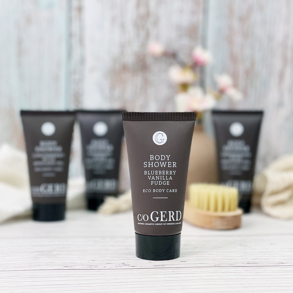 c/o GERDS BODY SHOWER Blueberry Vanilla Fudge doftar ljuvligt och tvättar skonsamt rent din hud, utan att torka ut den. Formulan, baserad på eko-certifierade ingredienser som är snälla mot djur och natur, löddar härligt. Doftsatt med ett naturligt arom. Kombinera gärna med Body Lotion Blueberry Vanilla Fudge, din hud kommer att tacka dig.