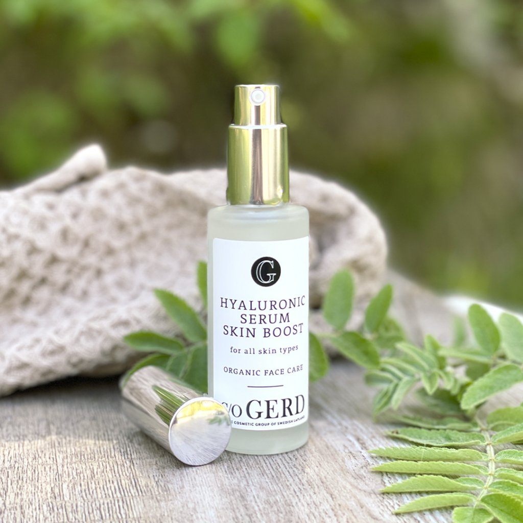 Hyaluronsyra är en fuktbindande långkedjig sockermolekyl som finns naturligt i huden, en naturlig polysackarid som finns i alla levande organismer. Då kroppen blir äldre kan den inte mera producera lika mycket hyaluronsyra som i ungdomsåren. Därför börjar rynkor och fåror bildas i huden. Hyaluronsyra är ett av de mest effektiva ämnen som kan hittas i naturkosmetiska anti-age produkter. Hyaluronsyran, som effektivt återfuktar huden inifrån, motverkar rynkor och slätar ut huden.