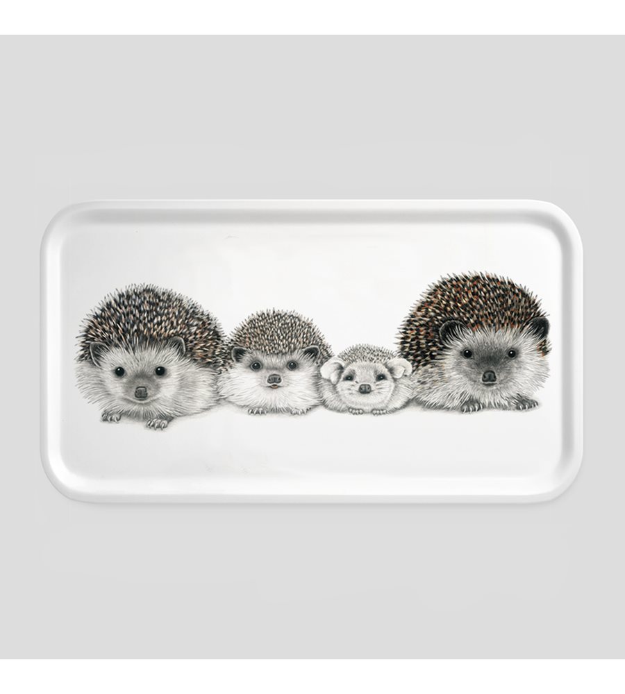 Lång bricka i laminerat bokträ med igelkottarna i Henrys Family. Brickan passar lika bra som ett mindre uppläggningsfat som till servering.