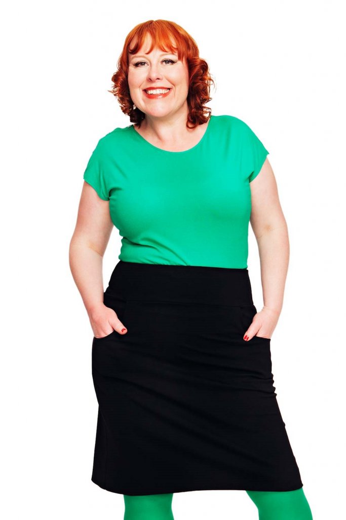 Majken är en bekväm kjol i en stadig viskostikå med figurnära passform. Kjolen har fickor och bred mudd i midjan. Längden är till strax ovanför knät.