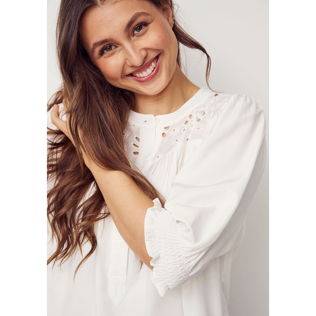 Cara s/s Blouse är en vacker och feminin blus som kombinerar romantiska detaljer med en tidlös silhuett. Den delikata broderingen på oket ger en exklusiv och raffinerad look, medan de luftiga 3/4-ärmarna skapar en lätt och moget look. Blusens lätta material gör den perfekt för såväl vår- som sommargarderoben.