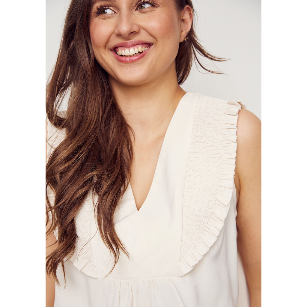 Cara Top är en feminin och elegant topp som kombinerar tidlös stil med fina detaljer. Den vackra V-ringningen framhäver halsen och axlarna, medan de dekorativa volangdetaljerna på axelpartiet ger en romantisk och sofistikerad touch. Den härliga viskosblandningen säkerställer en bekväm känsla, vilket gör toppen till ett perfekt val för arbete, vardagsklädsel och speciella tillfällen.