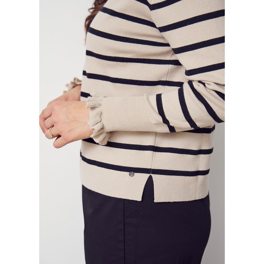 The Frigga Stripe Pullover is a wonderful addition to any wardrobe, combining classic design and comfort in the best possible way. With its high neck and fitted sleeves beautifully adorned with delicate ruffles, this pullover exudes feminine charm and style. The stretch offered by the pullover is a key factor in ensuring a good fit and freedom of movement throughout the day. Made of a soft cotton quality with a touch of elastane, it is both comfortable and shape-retaining. The discreet yet significant detail of the Isay signature brand at the bottom of the pullover adds an elegant finish to the otherwise simple design. Perfect for everyday wear, you can complete your look by styling the Frigga Stripe Pullover with a pair of high-waisted jeans.