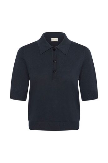 Modellen är 172 cm lång och bär storlek M. Denna kortärmade stickade piké har ett smalt randigt mönster, klassisk krage och knappslå med kontrastdetaljer. Den mjuka kvaliteten ger en bekväm passform. Styla med denim eller dressade byxor för en enkel vardagsstil.