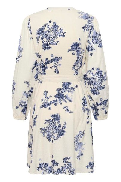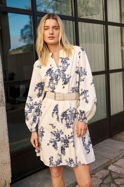 Avslappnad klänning med blommotiv, mjuk struktur och definierad midja. Långa ärmar, V-ringning med knappslå och knytband. Knälång modell.
