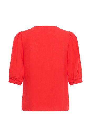 Modellen är 174 cm lång och bär storlek 36. Denna kortärmade blus är gjord i ett lätt material med rund hals, knäppning och mjukt rynkade ärmar. Den lediga formen ger ett feminint och avslappnat intryck. Styla med denim eller dressade byxor för vardagen.