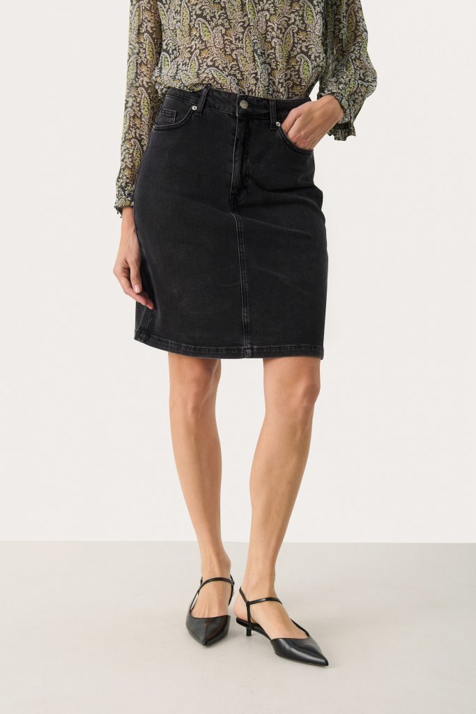 Denna svarta denim minikjol är en mångsidig garderobsklassiker. Tillverkad av premiumdenim, har den en smickrande hög midja och en klassisk design med fem fickor. Perfekt för både avslappnade och chica outfits, kombinera med en blus eller en T-shirt för en lättsam stil.