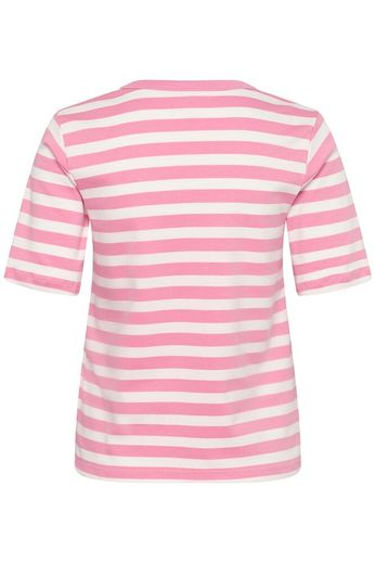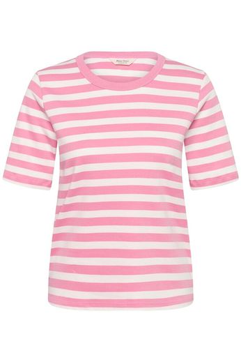 Modellen är 178 cm lång och bär storlek M. Denna klassiska T-shirt med rosa och vita ränder är tillverkad i 100 % bomull. Den har en smal passform, rund hals och korta ärmar som slutar vid armbågen. Ett enkelt och mångsidigt plagg – perfekt till jeans, shorts eller kjol året runt.