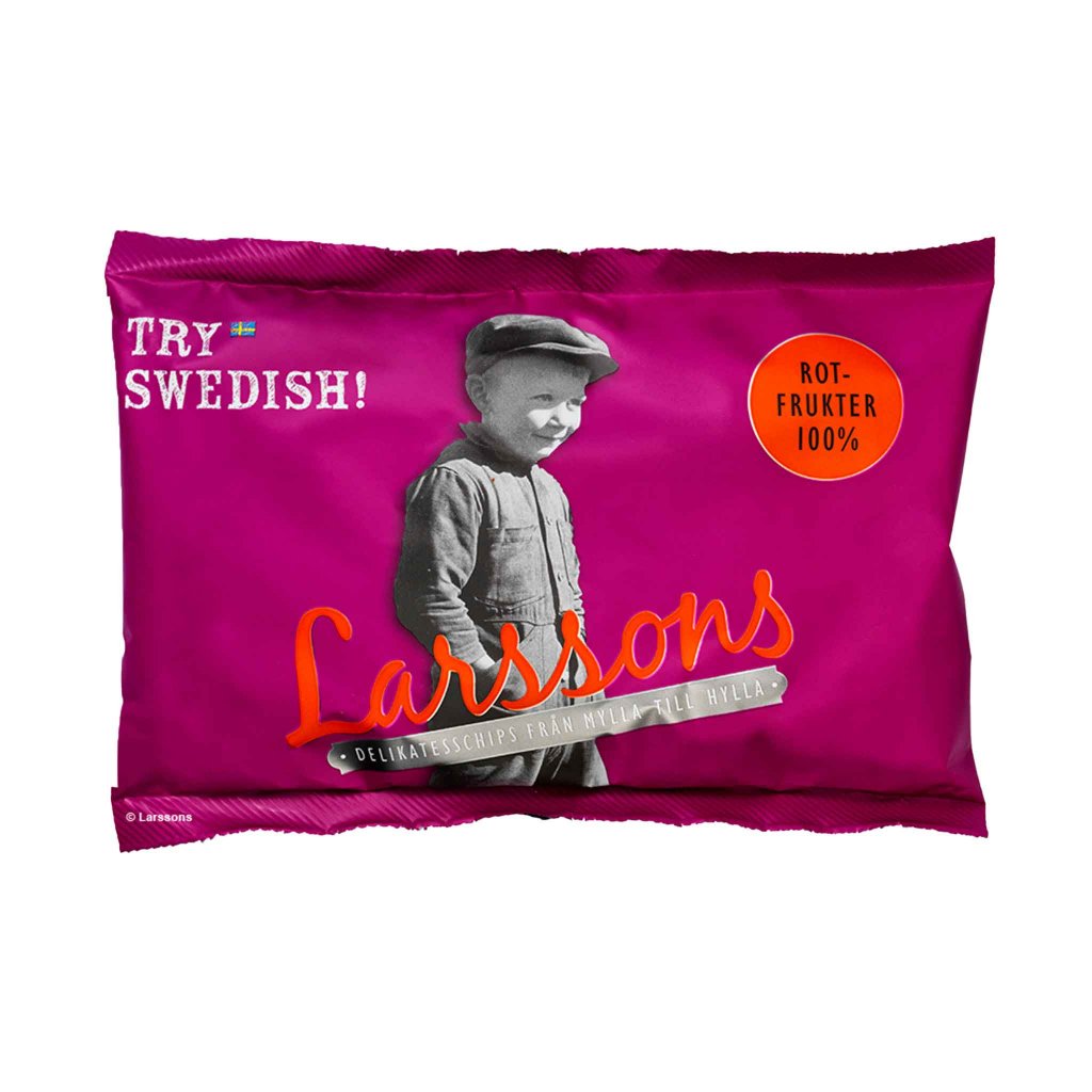 Krispiga rotfruktschips med palsternacka, persiljerot och rödbeta – den enda av Larssons chipssorter som inte innehåller potatis. De smakrika rotfrukterna står sig fint på egen hand och toppas enbart med lite havssalt.