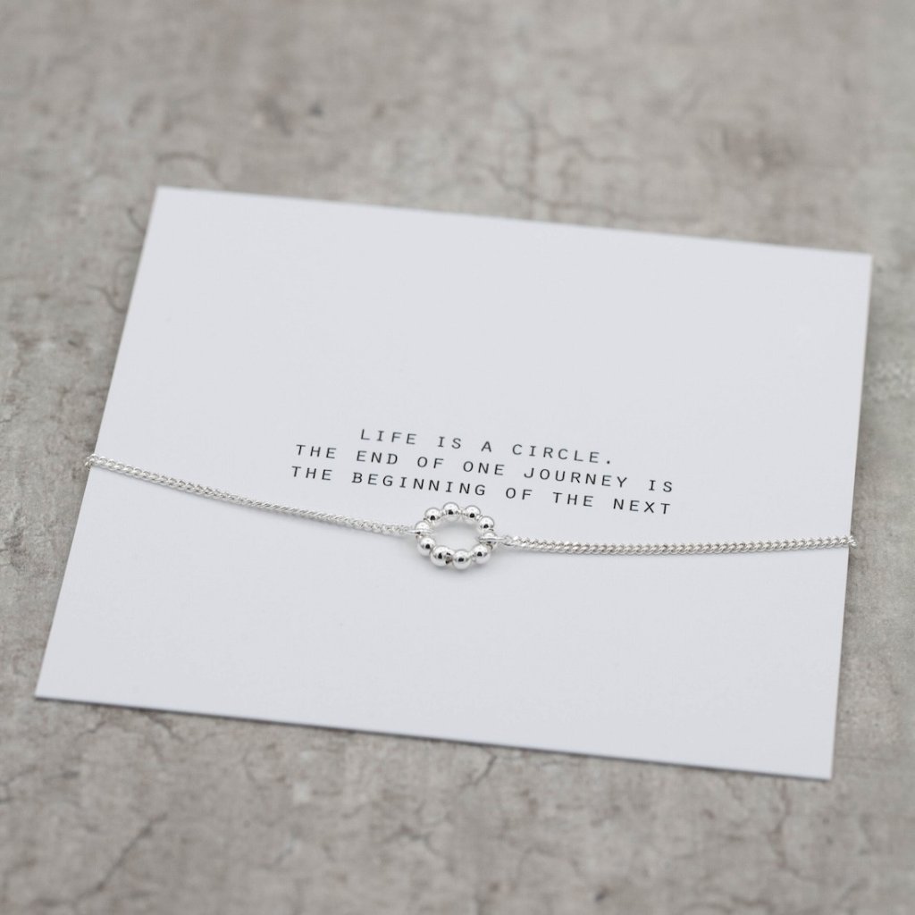 Fint tunt armband med en cirkel av små silverkulor. Vår cirkel symboliserar livet och kommer med tillhörande text. "Life is a circle. The end of one journey is the beginning of the next"