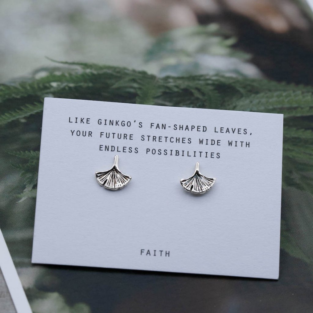 Örhängena kommer med texten: "Like Ginkgo's fan shaped leaves, your future stretches wide with endless possibilities."