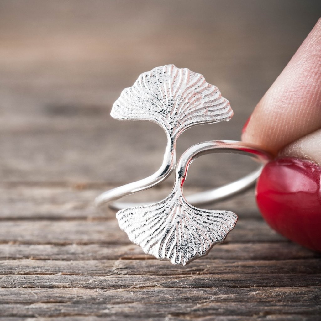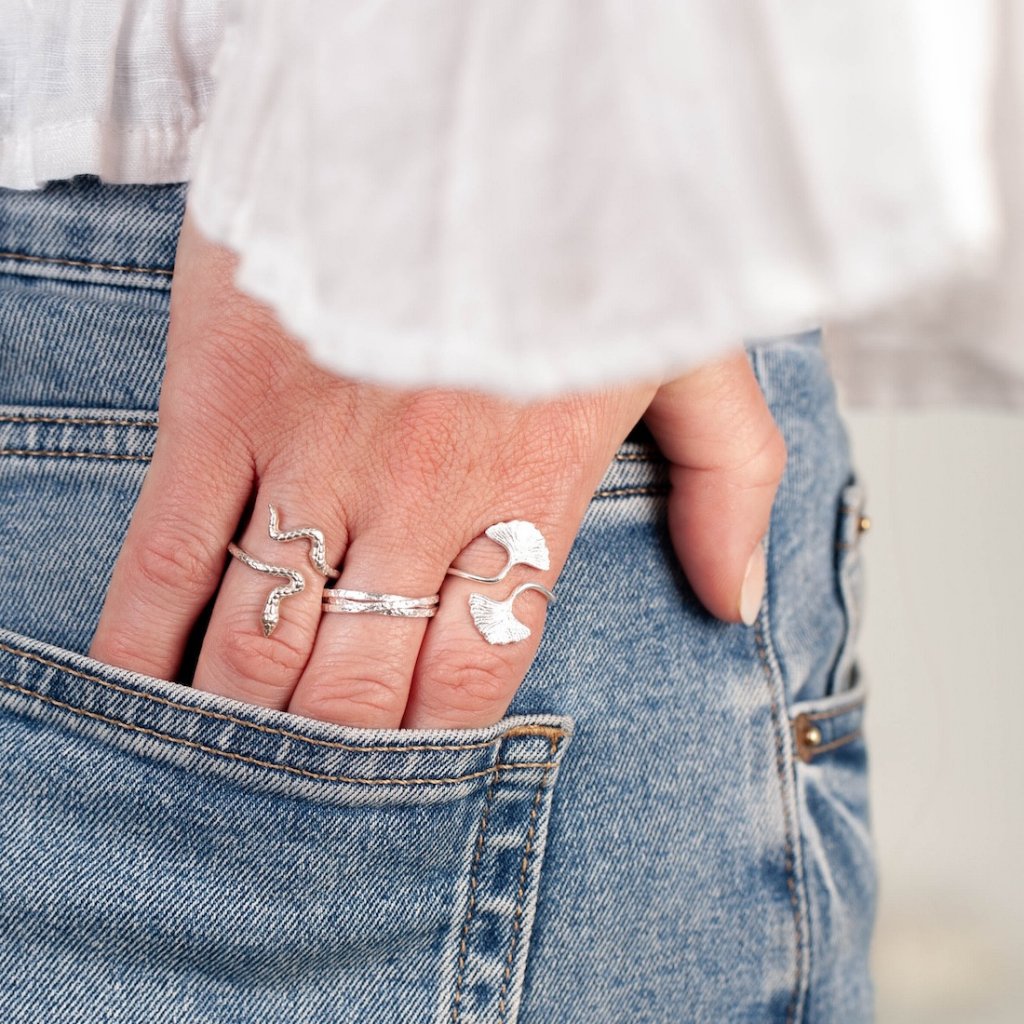 Ställbar silverring dekorerad med två Ginkgoblad på var sida. Ginkgobladen symboliserar styrka och möjligheter i framtidens äventyr.