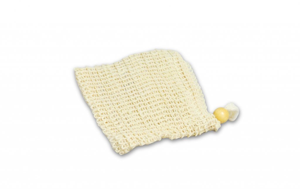 Tvålpåse i ekologisk bomull och naturlig sisal, som är den hållbara fibern från sisalplantans blad, en storvuxen, örtartad växt inom familjen sparrisväxter.